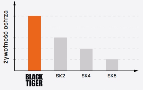 to narzędzie, które łączy w sobie wytrzymałość i funkcjonalność, idealne dla profesjonalistów i amatorów. Jego wyjątkowość zawdzięcza unikalnemu, opatentowanemu ostrzu BLACK TIGER, które zapewnia zwiększoną żywotność i wydajność w porównaniu do tradycyjnych noży z ostrzem wykonanym z stali SK2.